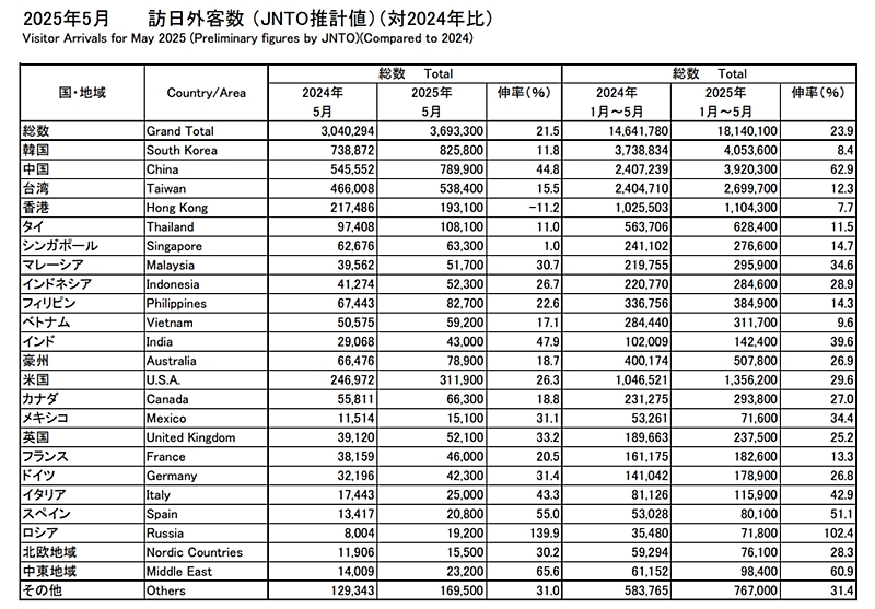 According to the latest data from the Japan National Tourism Organization (JNTO), a staggering 3.69 million foreign tourists visited Japan in May 2025, marking a 21.5% increase compared to the same month last year. This number exceeds the previous record for May, set in 2024, by over 650,000 visitors!