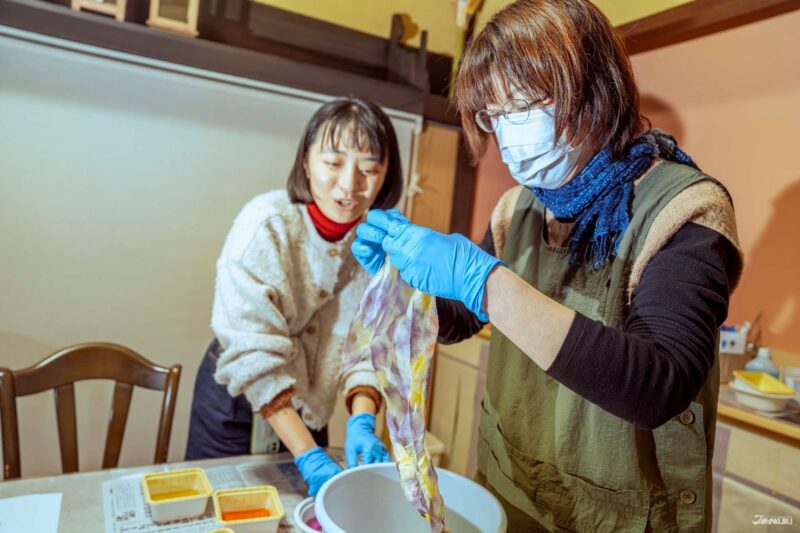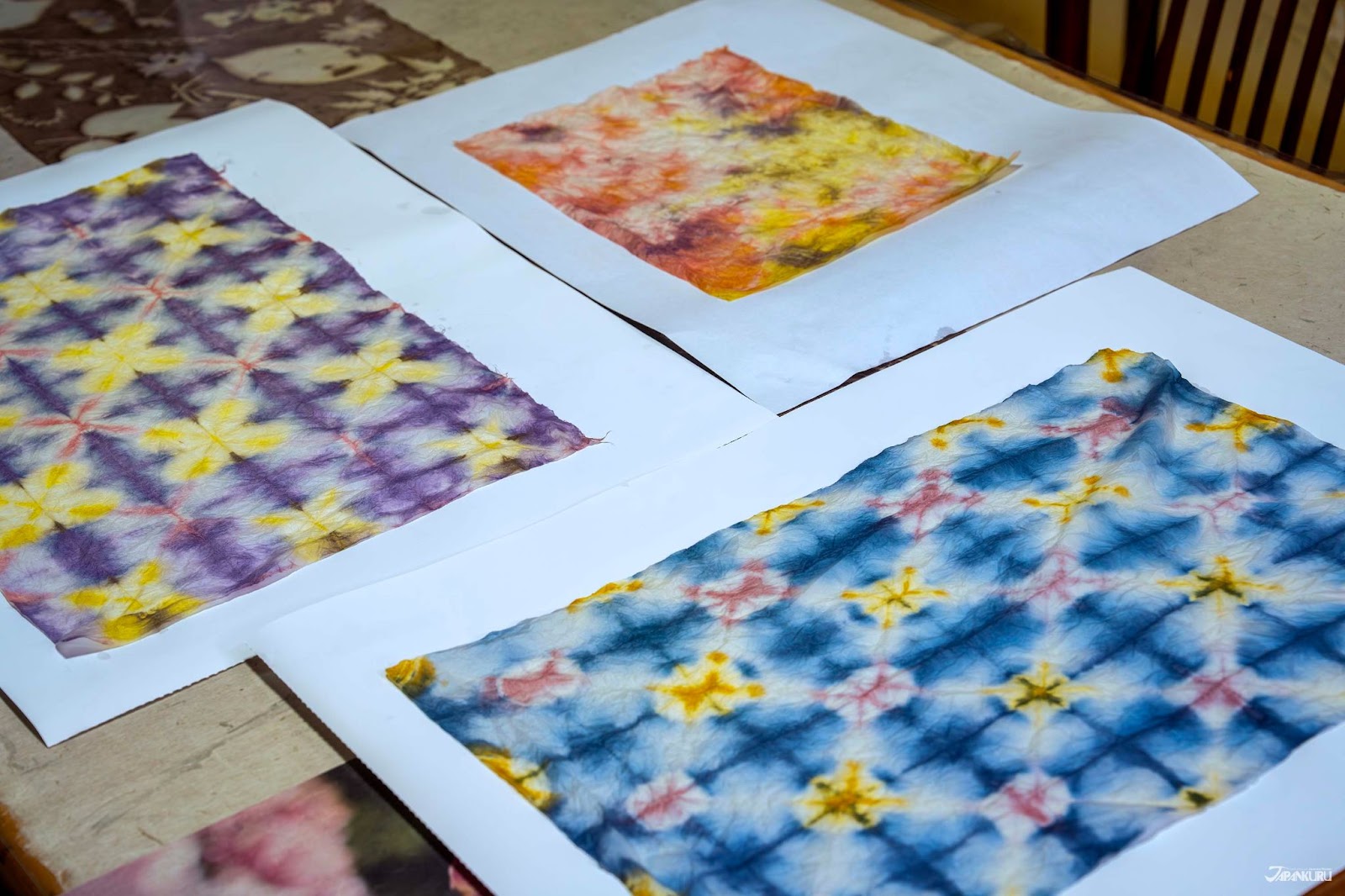 Hanya beberapa menit berkendara dari pabrik sake, Shikiroku Hirose Washi menawarkan workshop pewarnaan kertas washi alami.