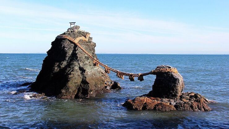 Tempat yang mengandung spiritual berikutnya adalah Meoto Iwa atau yang dikenal sebagai “Batu Pernikahan”, sepasang batu sakral yang terletak di lepas pantai Futami, sebuah kota dekat dengan Kuil Agung Ise. Batu-batu ini menjadi simbol pernikahan yang kuat dalam kepercayaan Shinto, oleh karena itu banyak pasangan yang mengunjungi tempat ini untuk berdoa agar pernikahan mereka kuat dan abadi. Ciri khas dari batu ini adalah ada dua batu yang dihubungkan oleh tali jerami suci Shinto yang disebut shimenawa, yang melambangkan ikatan perkawinan. Tali ini sangat besar, beratnya lebih dari satu ton, dan diganti tiga kali setahun dalam upacara Shinto khusus yang diadakan pada bulan Mei, September, dan Desember. Batu yang lebih besar melambangkan suami (Izanagi) dan memiliki gerbang torii Shinto kecil di puncaknya, sedangkan batu yang lebih kecil melambangkan istri (Izanami). Salah satu waktu terbaik untuk melihat batu-batu sakral ini adalah saat fajar selama musim panas.