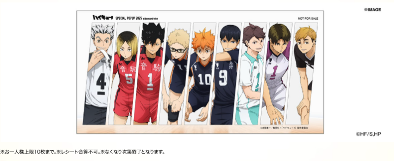 ‘서브를 기다리는 순간’을 테마로 새롭게 그려진 일러스트의 첫 공개는 물론 원작 분위기를 그대로 살린 포토존도 마련되어 있어 특별한 기념 사진도 남길 수 있어요. 또한, 굿즈를 2,000엔 이상 구매하면 랜덤 노벨티 카드도 증정 예정! 특히 도쿄 하라주쿠점은 특별 장식과 대형 포토존이 준비된 스페셜 공간으로 꾸며져 있답니다.