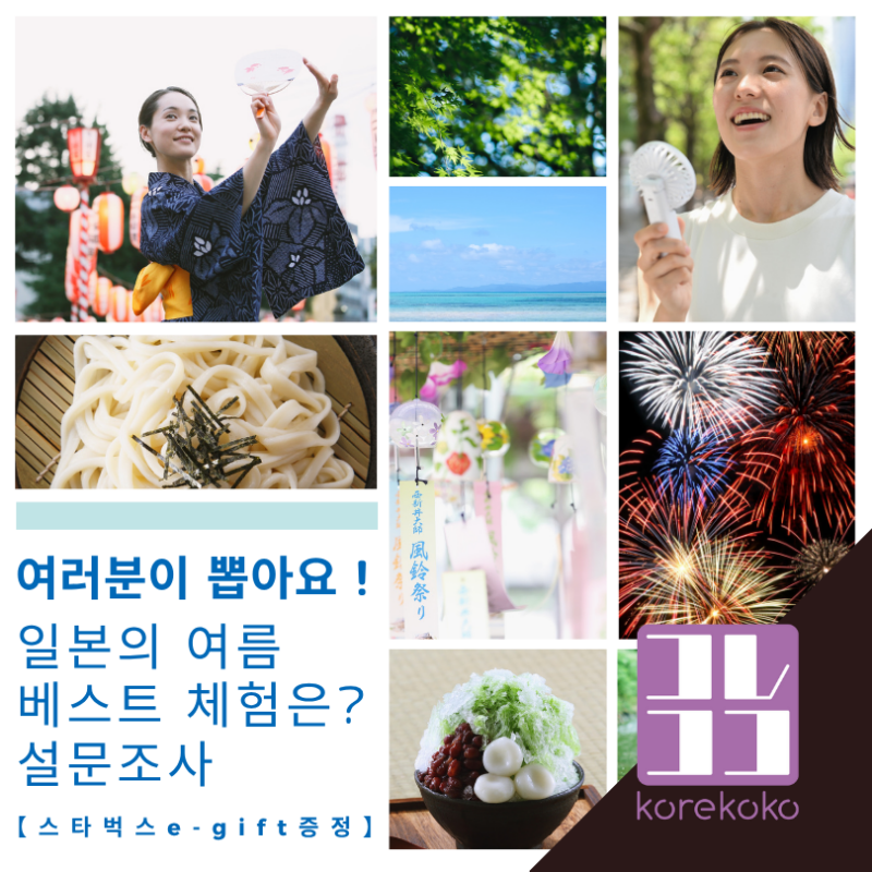일본의 여름, 여러분에겐 어떤 순간이 가장 기억에 남으셨나요? 불꽃놀이, 여름 한정 카페 메뉴, 에도풍 유카타 체험… 여러분만의 특별한 여름 이야기를 들려주세요! 지금 일본에 거주 중인 분들을 대상으로 일본 거주 외국인 대상 체험 활동 ‘korekoko’에서 ‘일본의 여름 베스트 체험🍉🏖️🪭‘ 설문조사를 진행합니다. 참여해 주신 분들 중 선착순 50명께 스타벅스 커피 e-기프트(700엔 상당) 을 선물로 드려요!
