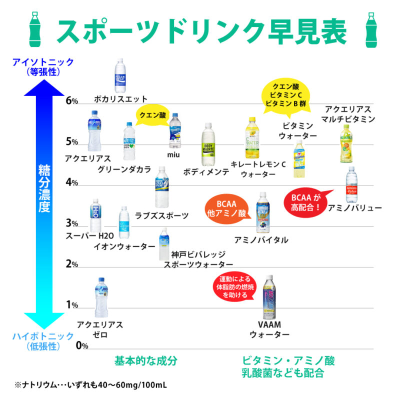 아래 도표는 일본에서 인기 있는 스포츠 음료를 당도 농도와 성분 특성별로 비교한 내용인데, 왼쪽일수록 저당(하이포토닉),위로 갈수록 고당(아이소토닉) 성격을 갖고 있어 참고하면 좋아요!