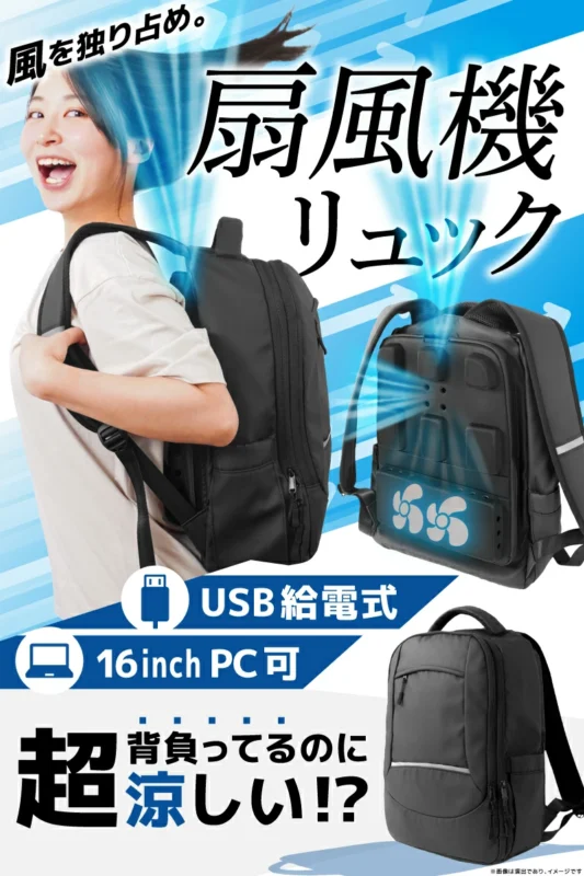짐은 많아서 백팩을 자주 이용하는데 여름만되면 땀 때문에 망설여진다는 분 많으시죠? 그런 고민을 단번에 해결해줄 선풍기 백팩이 일본에 등장했습니다! 이름 그대로 백팩과 선풍기가 합펴진 이 제품은 허리 부분에 탑재된 W팬이 등과 목덜미에 직접 바람을 쏴줘서 한여름 야외에서도 시원하게 착용 가능해요.