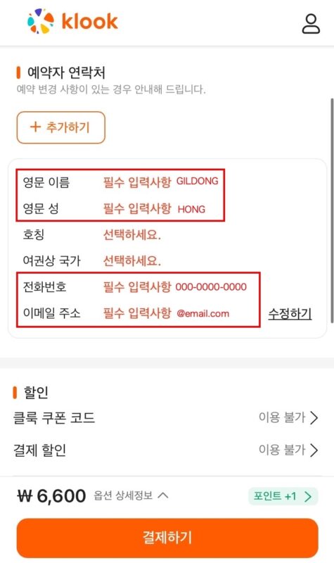 3. 예약 시 필수 입력 사항 작성 : 영문 이름, 영문 성, 전화번호 (한국 번호도 가능), 이메일 주소