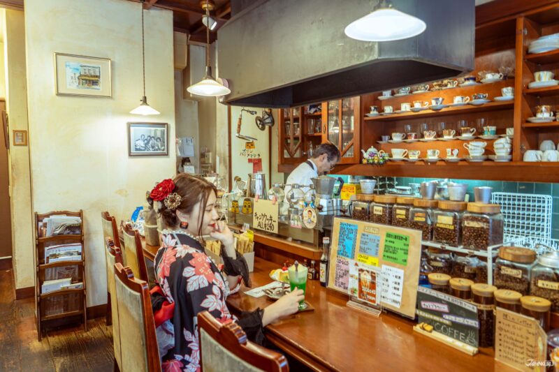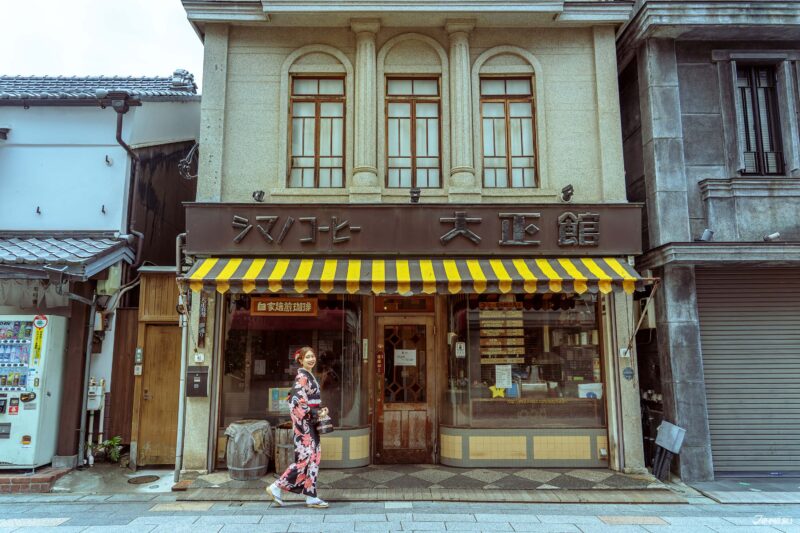 다이쇼 로망 유메도리에는 약 35개의 아기자기한 상점들이 늘어서 있어 골목을 걷기만 해도 소소한 매력을 느낄 수 있습니다. 그중에서도 꼭 들러보길 추천하는 곳은 바로 ‘시마노 커피 다이쇼관’. 1996년 8월 24일 문을 연 이곳은 다이쇼 시대의 분위기를 고스란히 담은 정통 킷사텐(일본식 찻집)으로, 자가 로스팅한 깊은 풍미의 커피로도 유명해 레트로 감성을 한껏 즐기기 좋은 곳입니다.