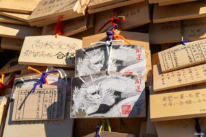 หนึ่งสิ่งที่ยืนยันว่าศาลเจ้าแห่งนี้ขึ้นชื่อเรื่องการขอพรด้านการเรียน การสอบ คือป้ายเขียนขอพร หรือเอะมะ(絵馬) เกือบทุกป้ายจะเขียนว่า 合格 ซึ่งหมายถึงการสอบผ่าน มีทั้งเขียนขอให้สอบเข้ามหาวิทยาลัยได้ ขอให้สอบเข้าโรงเรียนมัธยมได้ (合格祈願)