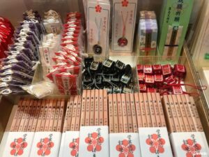 อย่างที่บอกไปว่าศาลเจ้าแห่งนี้ดังเรื่องการเรียน การสอบผ่านมาก ๆ ทำให้เครื่องรางส่วนมาก จะเป็นไปในแนวการเรียน การสอบ ส่วนด้านอื่น ๆ ทั้งด้านความรัก การเงิน การหางาน สุขภาพก็มีเช่นกัน เครื่องรางด้านการเรียน ไม่จะเป็นเครื่องรางแบบพก แบบวางไว้ที่บ้าน เป็นรูปกระเป๋านักเรียน หรือดินสอ ปากกาที่ไว้ทำข้อสอบ มีให้เลือกกันตามความชอบเลยทีเดียว