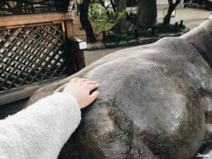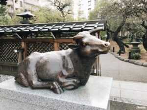 นอกจากนี้ยังมีน้องวัวหน้าตาน่ารักอยู่ในศาลเจ้าด้วย ชาวญี่ปุ่นมีความเชื่อกันว่าหากมีอาการป่วยที่ส่วนใดของร่างกาย ให้ลูบส่วนนั้นของวัว อาการก็จะดีขึ้น