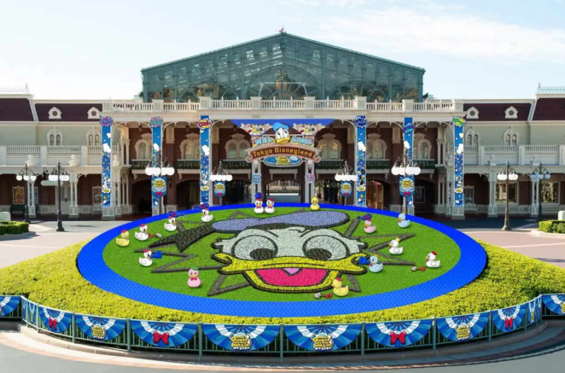ตอนที่เราเดินเข้าสู่ปาร์ค ก็จะถูกต้อนรับด้วยแปลงดอกไม้สวย ๆ รูปโดนัลด์ดั๊ก รวมถึงป้ายแบนเนอร์ก็จะเปลี่ยนให้เป็นธีม Donald’s Quacky Duck! Duck! Duck City!