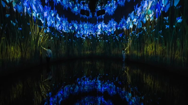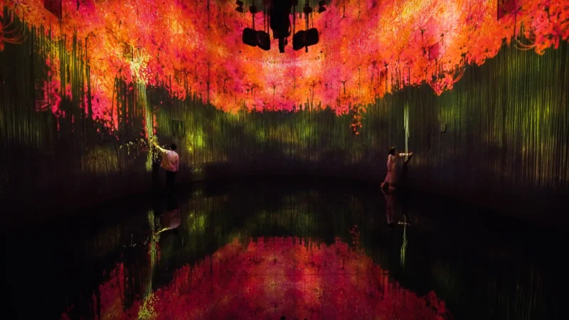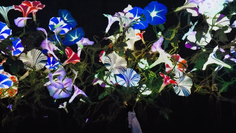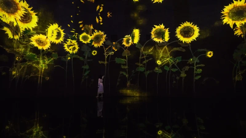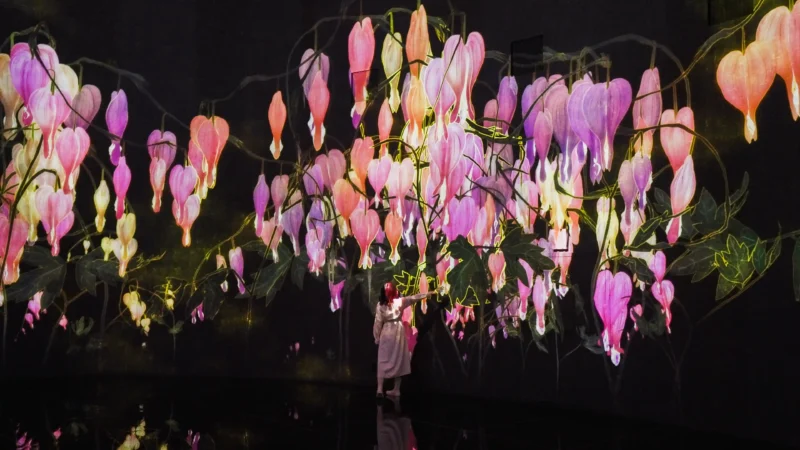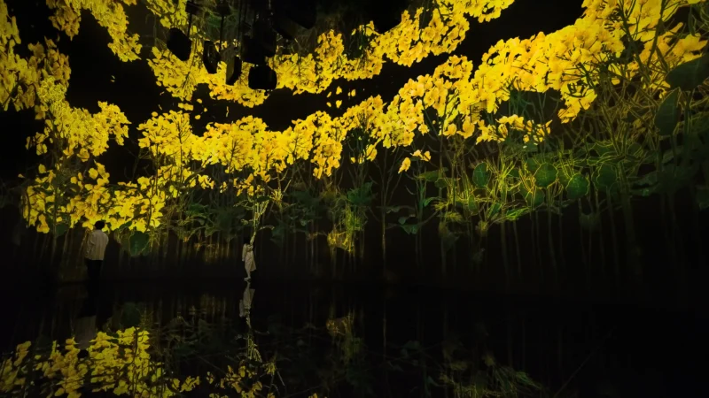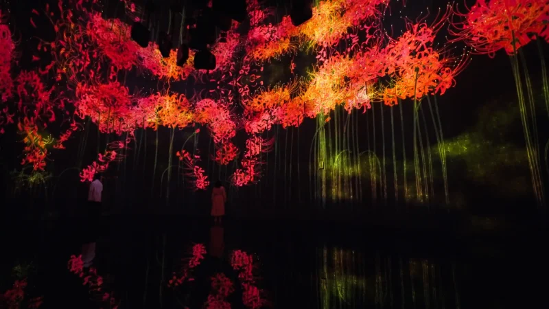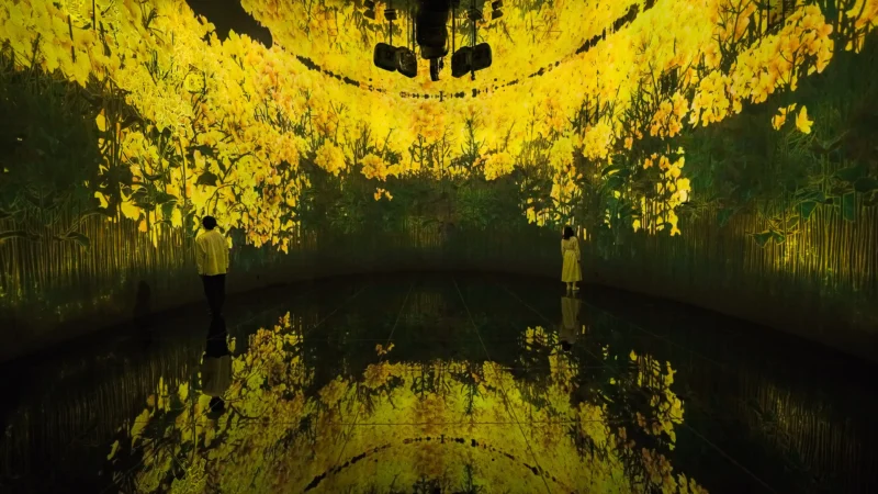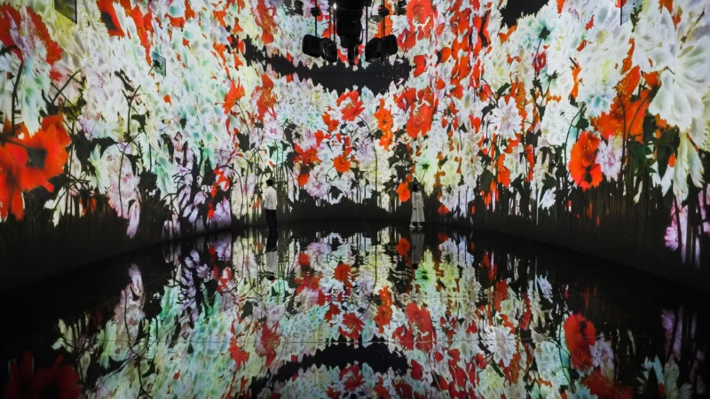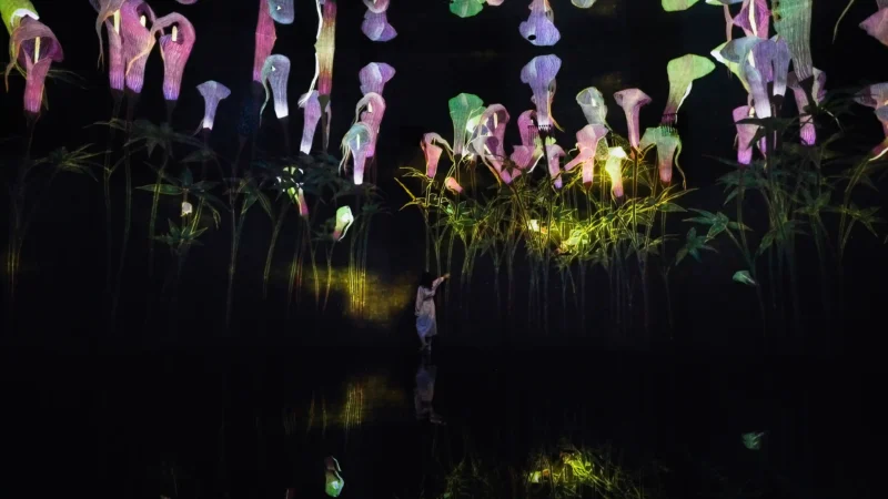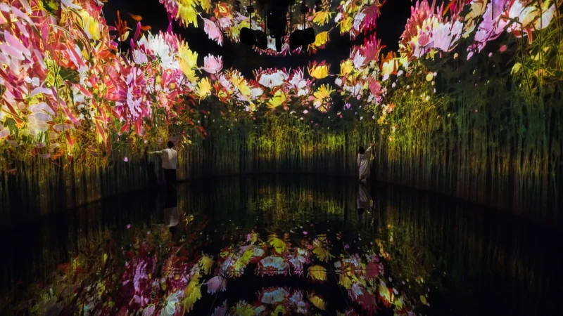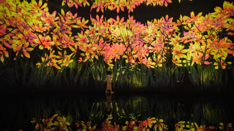teamLab สร้างพื้นที่ที่เหนือจินตนาการขึ้นมาเพื่อทำลายพรมแดนระหว่างผู้คน และงานศิลปะ ภายใต้เทคนิคการจัดภาพ และงานศิลป์ และยังสามารถเล่นกับงานศิลป์ได้อีกด้วย เมื่อเราเอามือไปแตะดอกไม้ มันจะค่อย ๆ ร่วงหล่นไปตามคอนเซปต์ที่วางเอาไว้