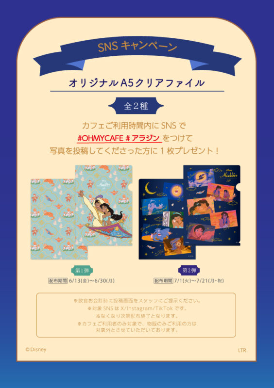 - เมื่อมาใช้บริการที่ร้าน และโพสต์ภาพลง SNS พร้อมติดแท็ก #OHMYCAFE #アラジン จะได้รับแฟ้มใสขนาด A5 ฟรี 1 ชิ้น ลายด้านซ้ายจะแจกช่วง 13 – 30 มิถุนายน และลายด้านขวาจะแจก 1 – 21 กรกฏาคม