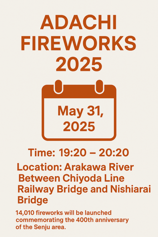 งานเทศกาลดอกไม้ไฟอาดาจิ (Adachi Fireworks Festival) ประจำปี 2025 จะจัดขึ้นในวันเสาร์ที่ 31 พฤษภาคม 2025 เวลา 19:20 น. ถึง 20:20 น. ที่บริเวณริมแม่น้ำอารากาวะ ระหว่างสะพานรถไฟใต้ดินโตเกียวเมโทรสายจิโยดะและสะพานนิชิอาราอิ ในเขตอาดาจิ กรุงโตเกียว