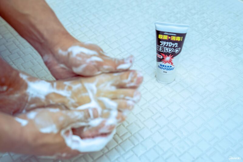 หรือสำหรับใครที่เดินทั้งวันจนเหงื่อออกเท้าเยอะและมีกลิ่นอับ สบู่ล้างเท้า Butenalock® ของฮิตซามิตสึคือไอเทมสุดเพอร์เฟกต์ สามารถช่วยฆ่าแบคทีเรียที่เท้า ตัวสบู่มีเมนทอลและมีกลิ่นของน้ำมันทีทรีทำให้รู้สึกสดชื่น แม้จะเดินมาทั้งวันก็สะอาดไร้กลิ่น