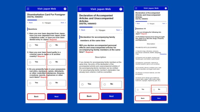 - หากไม่มีสิ่งของต้องสำแดง ให้เลือก “No” สำหรับทุกข้อ