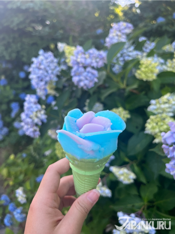 ตอนออกมาจากวัดอย่าลืมหาทานบาบะเฮระไอซ์ หรือที่บางคนเรียกว่าไอศกรีมคุณป้าด้วยนะคะ ไอศกรีมรูปกุหลาบนี่เป็นของดีขึ้นชื่อของจังหวัดอาคิตะเลยค่ะ และที่สำคัญ รสที่ขายหน้าวัดเป็นรสพิเศษที่หาทานได้ยากมาก ๆ สีฟ้าและม่วงตามสีของดอกไฮเดรนเยียค่ะ รสชาติจะเป็นรสองุ่นกับโซดา สดชื่นเหมาะกับอากาศร้อน ๆ มากเลยค่ะ