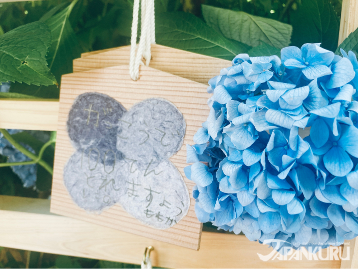 ในส่วนของที่ระลึกก็น่ารักมาก ๆ ค่ะ มีพวกเครื่องรางโอมาโมริลายสีฟ้าขาวที่เป็นสีของไฮเดรนเยียด้วยค่ะ ทางวัดบอกว่าเป็นการตัดมาจากผ้าผืนใหญ่ ๆ ผืนเดียวมาทำโอมาโมริ ดังนั้นแต่ละชิ้นก็จะมีลายที่แตกต่างกัน ตอนปี 2022 ที่ไปมีขายโหลกลีบดอกไฮเดรนเยียด้วยค่ะ ก็เลยได้ชิ้นนั้นกลับมาพร้อมกับโอมาโมริด้วยเลย