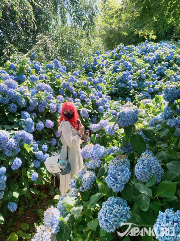 พอเดินเข้ามาก็จะเจอกับดงดอกไฮเดรนเยียขนาดใหญ่มาก ๆ เลยค่ะ ตอนนั้นโชคดีมาก ๆ ที่เป็นจังหวะที่แทบไม่มีคน (เพราะตอนกลางวันแดดจ้าสุด ๆ ค่ะ คนไม่ค่อยสู้) เลยได้รูปกลางดอกไฮเดรนเยียสีฟ้าไปแบบเต็ม ๆ เลย