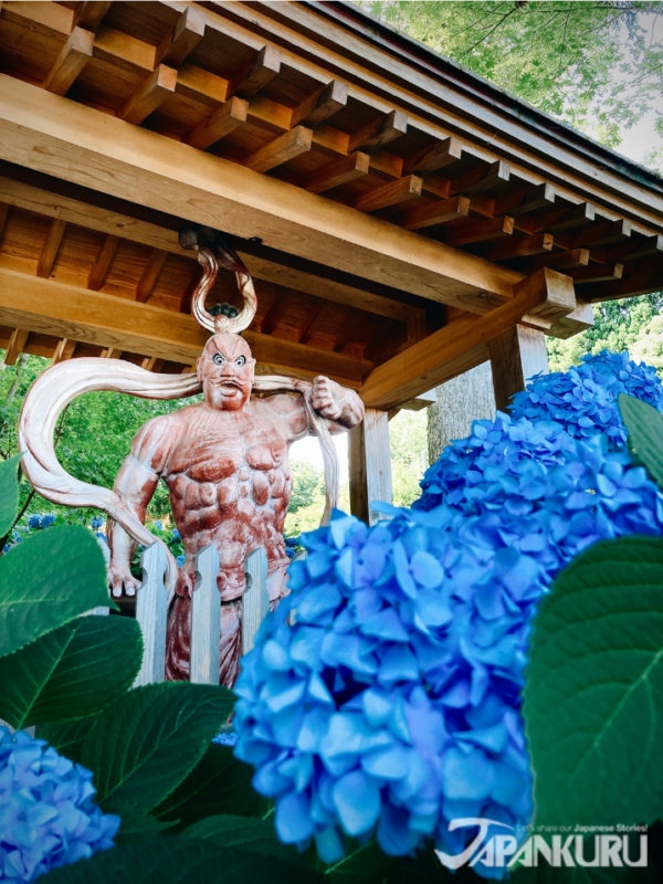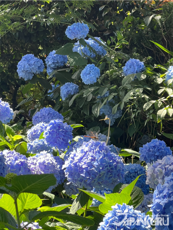 รู้สึกว่าพอห้อมล้อมไปด้วยไฮเดรนเยียสีฟ้าแล้ว พวกสถาปัตยกรรมต่าง ๆ ในวัดนี่สวยขึ้นเป็นสองเท่าเลยนะคะ นอกจากนี้ วัดนี้อยู่ที่เมืองโอกะ ซึ่งเป็นเมืองติดทะเล แน่นอนค่ะว่าเราจะได้เห็นวิวทะเลด้วยแน่นอน แต่แดดแรงมาก ขอไม่สู้แดดนะคะ ขนาดน้องไฮเดรนเยียยังกรอบเลยค่ะ