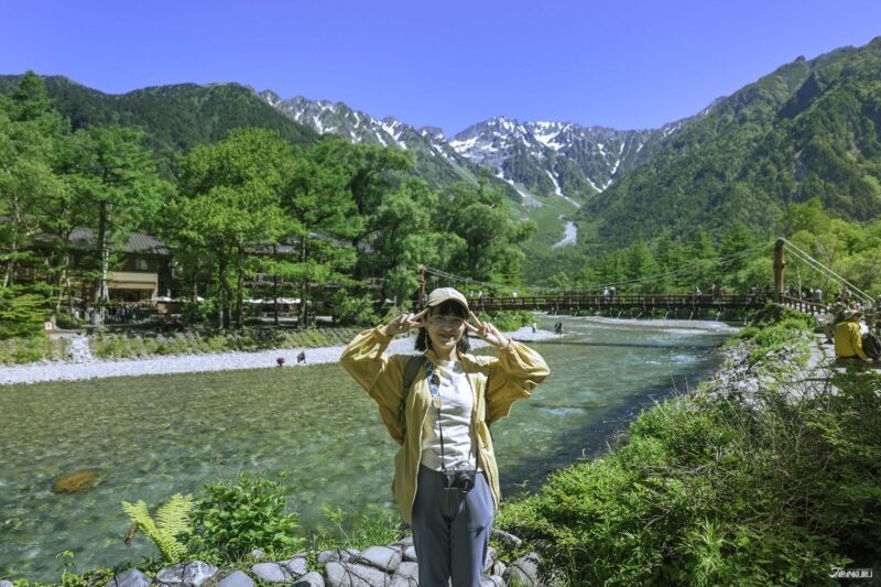 สะพานคัปปะ (Kappa-bashi) สะพานไม้ที่เห็นวิวภูเขาโฮตากะ (Mount Hotaka) และแม่น้ำอาซุสะได้แบบเต็ม ๆ