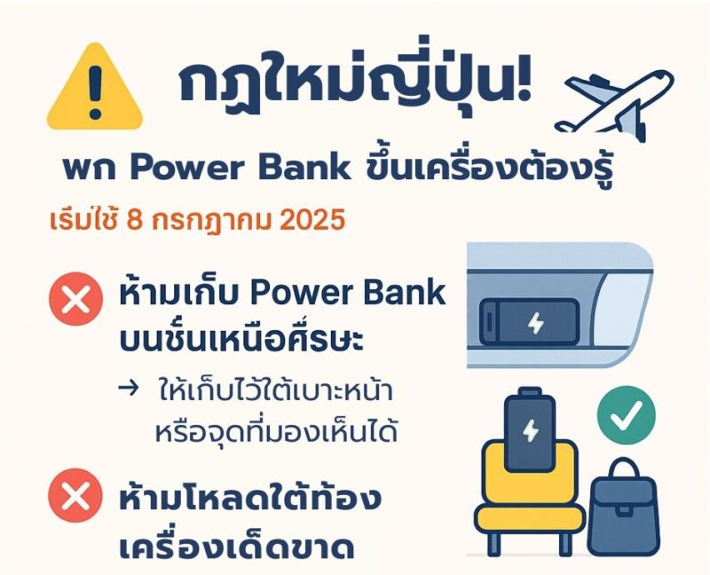 ตั้งแต่วันที่ 8 กรกฎาคม ค.ศ. 2025 เป็นต้นไป ญี่ปุ่นประกาศใช้กฎใหม่เกี่ยวกับการพกพา Power Bank (แบตเตอรี่สำรอง) ขึ้นเครื่องบิน เพื่อยกระดับความปลอดภัยบนเที่ยวบินภายในประเทศ หลังเกิดเหตุเพลิงไหม้จากแบตเตอรี่ในหลายสายการบิน