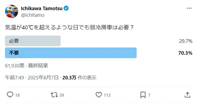 ต่อมามีการทำโพลถามว่า “ในวันที่อุณหภูมิสูงเกิน 40℃ ยังจำเป็นต้องมีตู้แอร์อ่อนอยู่ไหม?” ผลปรากฏว่า 70.3% โหวตว่าไม่จำเป็น ขณะเดียวกันก็มีเสียงสะท้อนอีกด้านว่า “ทำไมถึงไม่มีตู้แอร์แรงพิเศษ (強冷房車) สำหรับคนขี้ร้อนบ้างนะ?”