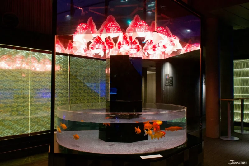 ภายในจัดโซนนิทรรศการให้เราได้เรียนรู้ความเป็นมาของปลาทองในโตเกียว ผ่านไทม์ไลน์และภาพพิมพ์อุคิโยเอะ ก่อนจะเข้าสู่โซน “Edo-rium” ที่เต็มไปด้วยปลาทองญี่ปุ่นหลากหลายสายพันธุ์กว่า 15 ชนิด ตั้งแต่ริวคิน(琉金) ไปจนถึงรันชู(蘭鋳) สีสันสดใส งดงามไม่แพ้ผลงานศิลปะ
