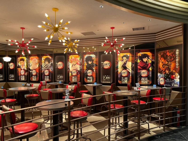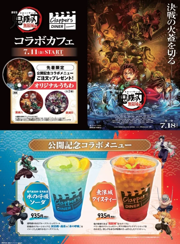 ที่ Grand Cinema Sunshine Ikebukuro นอกจากจะได้ชม ดาบพิฆาตอสูร ปราสาทไร้ขอบเขต องก์ที่ 1 การกลับมาของอาคาสะ กันบนจอยักษ์แล้ว ที่นี่ยังเปิดคาเฟ่ธีมดาบพิฆาตอสูรสุดพิเศษ จัดขึ้นที่ร้าน Clappers Diner ภายใน Grand Cinema Sunshine อิเคบุคุโระ