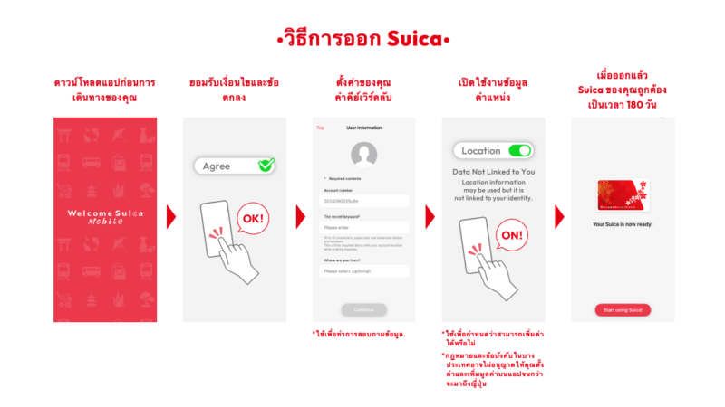 เมื่อทุกอย่างพร้อมแล้วก็สามารถออกบัตร Suica และเติมเงินได้ทันที แต่มีสิ่งหนึ่งที่ต้องไม่ลืมคือเปิดการเข้าถึงตำแหน่งที่ตั้ง (Location) เพราะหากไม่เปิด จะไม่สามารถออกบัตรหรือเติมเงินได้
