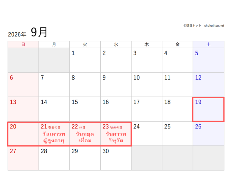- 22 กันยายน 2026 (อังคาร) วันหยุดเชื่อมที่เกิดขึ้นเพราะอยู่ระหว่างวันหยุดสองวันหลัก