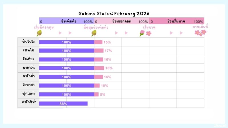 วันที่ 5 กุมภาพันธ์ 2026 ที่ผ่านมา Japan Meteorological Corporation(JMC) ได้ออกพยากรณ์ซากุระฉบับที่ 4 มาแล้ว JAPANKURU ได้ทำตารางสรุปและภาพประกอบของแต่ละพื้นที่มาให้แล้ว มาลองดูภาพรวมกัน✨