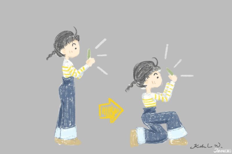 現在一般的手機的相機,大多都是搭載廣角鏡頭,因此只要放低角度仰拍看看就可以了。