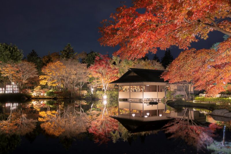 日本庭園則是池泉回遊式設計,圍繞池塘行走,隨著秋季變化,楓葉由綠轉黃,再變紅(預計11中下旬最為美艷)。木橋與歡楓亭等建築在夜晚的池水中倒映,宛如鏡面反射般美麗。該庭園是為紀念天皇皇后兩陛下的結婚而修建。