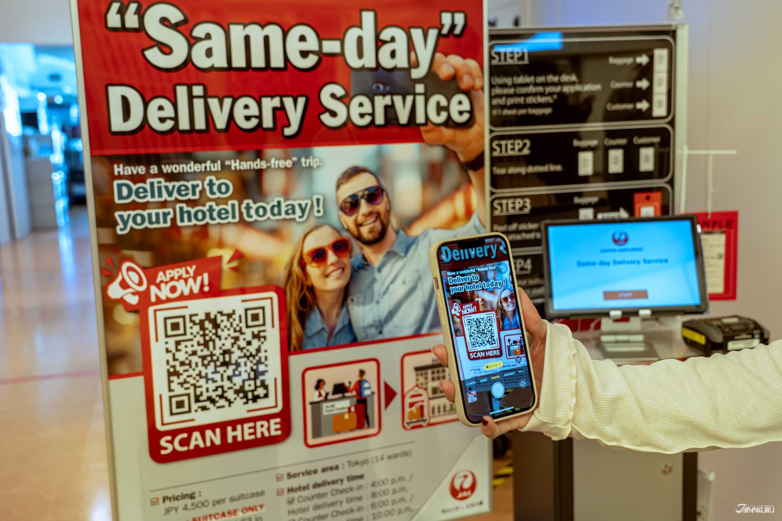 到了JAL ABC櫃檯後,在平板右側有寫著「Same-day Delivery Service」的QR Code,首先先用手機讀取QR Code,將操作頁面打開。