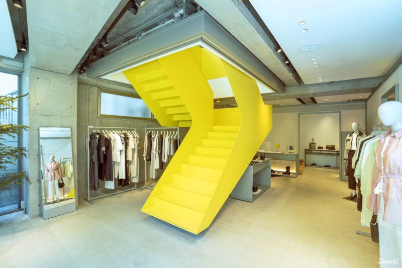 但別以為這樣就結束了!在通往二樓前,目光一定會被眼前這座半懸浮設計的亮眼「黃色階梯」所吸引。簡潔俐落的結構帶來強烈的視覺衝擊,早已成為東京青山區內最具標誌性的設計亮點之一。挑選完心儀的品項,離開前別忘了留下一枚你的時尚足跡!📸✨
