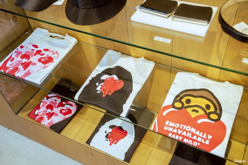 LOVELESS青山店的二樓集結了來自日本與歐洲的高感度潮流選品,雖定位為男裝區,但同樣深受喜愛中性打扮的女性顧客喜愛。像是日本本土品牌「©SAINT Mxxxxxx」,以洗舊質感與手寫字體營造出濃厚的街頭叛逆感;同樣來自日本的「A BATHING APE®」,推出了其與香港藝人陳冠希的品牌「EMOTIONALLY UNAVAILABLE」的聯名商品,標誌性的猿人圖騰與滴血愛心圖案辨識度極高。「Needles」則以風格鮮明的運動風拼接單品與蝴蝶刺繡為標誌性元素;來自義大利的「C.P. COMPANY」則以功能性,軍事風格的加工技術和設計聞名,店內展示的也是其中超期熱銷款!