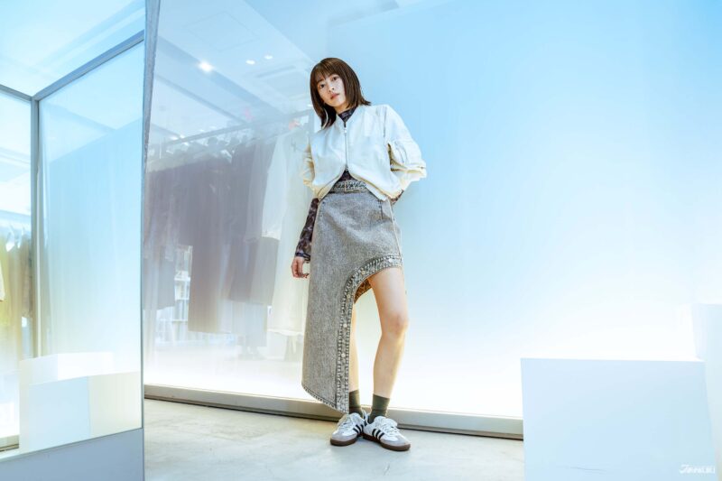 第二套的風格與第一套截然不同,呈現出融合現代與復古元素的「Y2K混搭風格」。上身搭配短版白色飛行夾克與內層印花網紗,營造層次分明、充滿科技感的視覺效果,下身則穿上不對稱剪裁的灰色刷白丹寧裙,側開高衩設計大膽前衛,強調Y2K風格中的叛逆精神。最後再以球鞋搭中筒襪收尾,不僅呼應上半身的誇張張力,也在視覺上創造出一種平衡感,讓前衛風格得以自然地融入日常穿搭之中。