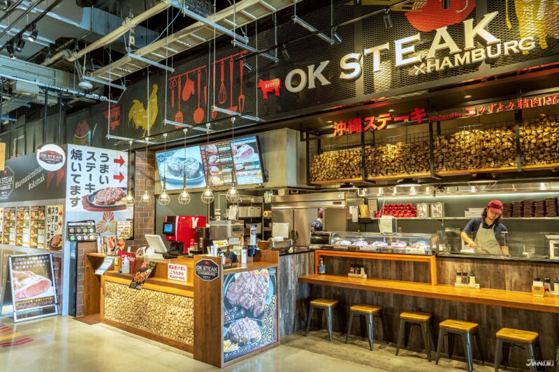 在國際通一帶經常大排長龍、被譽為沖繩最划算的牛排店「OK STEAK」,在iias 沖繩豐崎 也吃得到!主打高品質、高CP值的牛排料理,每份牛排托盤上還附上一塊加熱用木炭,讓你可以邊吃邊加熱,隨時調整溫度與口感。