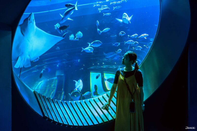 當然,說到館內最具代表性的經典設施,就不能錯過兩大人氣打卡熱點:水母展區與大型圓形觀景缸。圓柱狀的水母缸在鏡面與燈光交錯中閃爍夢幻藍光,水母緩緩漂浮,宛如漫遊深海,浪漫又療癒。站在大型圓形觀景缸則彷彿讓人置身海洋核心,魟魚、鯊魚與熱帶魚群從眼前優雅游過。視覺震撼完全不輸大型水族館!