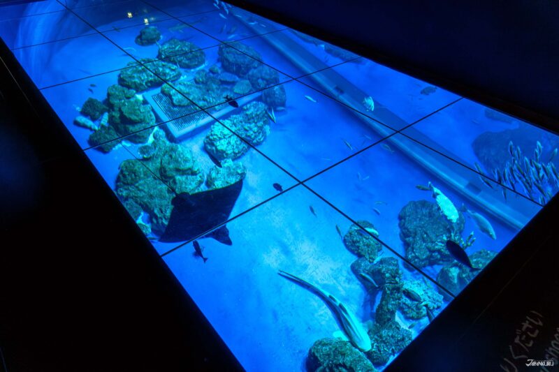 雖然名為水族館,但這裡的內容早已跳脫傳統框架,呈現的是一場融合森林、生物與海洋的多重體驗。從二樓入口進入,首先映入眼簾的是以「亞熱帶常綠之森」為主題的展示區,你可以近距離觀察樹懶、綠鬣蜥等這些神秘又可愛的森林居民。繼續往前走,會來到一處設有透明玻璃觀景水槽的區域,腳下的海洋生物悠游其間,讓人宛如行走在海面之上,感受十足的臨場震撼感。