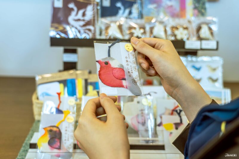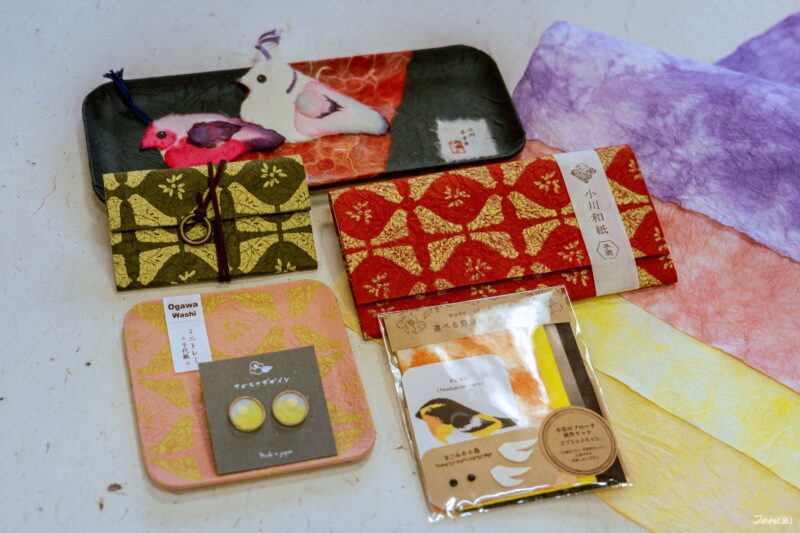 離小川町觀光導覽所不遠,有一家專門販售和紙與文創商品的店鋪——「手漉和紙之村」。這裡不僅有各式渲染和紙,還有以和紙製成的創意商品,從錢包到耳環,甚至日本人在結婚時使用的信封袋,都能以渲染和紙點綴,為傳統增添一絲現代感。其中,特別推薦小鳥書籤,不規則的紙邊完美呈現羽毛的細膩質感,栩栩如生,讓人忍不住想整組收藏 💖~