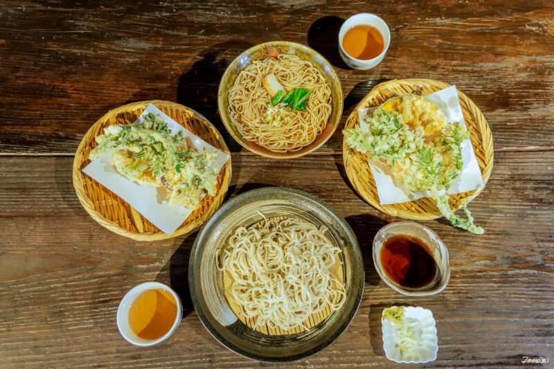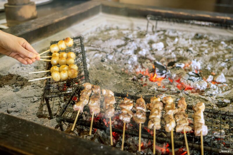 店家建議先從糰子開始烤,烤至表面微焦,可以沾點店家附贈的醬油提味。接著放上雞肉串,一邊品嚐香氣四溢的糰子,一邊靜靜等待雞肉串烤熟。此外,這裡的手打蕎麥麵也不可錯過,小川町水質純淨,使蕎麥麵口感更細緻,與炭火料理完美搭配。圍坐爐邊,聽著炭火燃燒的白噪音,邊品嚐美味的料理,這頓飯,不僅是味覺與聽覺的享受,更是一場充滿儀式感的體驗。