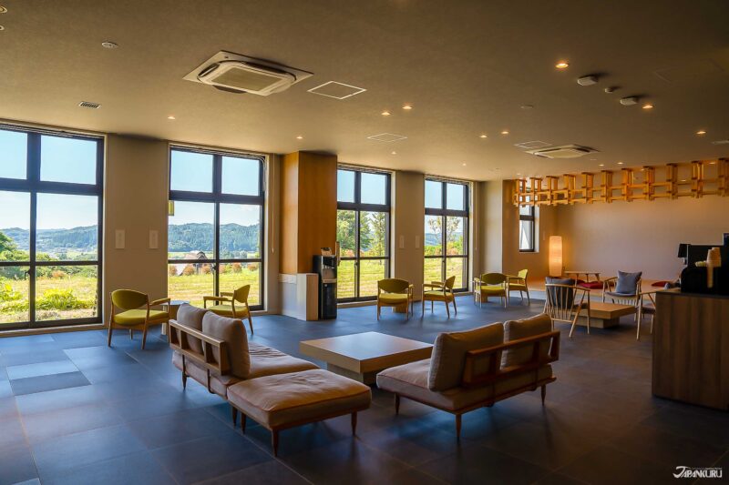 坐落在距離JR平泉站約8分鐘車程的小山丘上,奧州・平泉溫泉旅館 ITSUMU是一間頗有老屋之風的溫泉旅館,能眺望松尾芭蕉到訪平泉時亦眺望過的古戰場田園景色。雖然建築外觀古色古香,走入飯店後映入眼簾的,是以明亮的木質裝璜的現代和風空間,搭配大面積的落地玻璃窗,採光極佳,更讓寬敞的大廳空間顯得格外溫馨舒適。