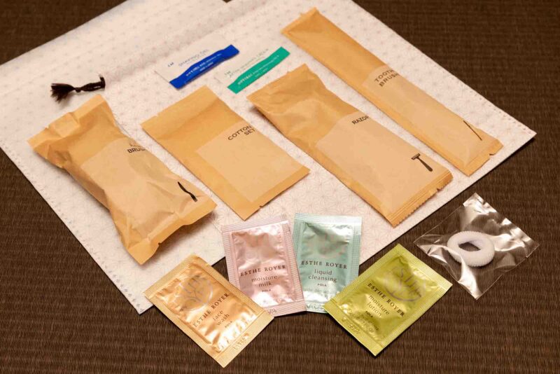 為響應環保,奧州・平泉溫泉旅館 ITSUMU的房間內基本不放置一次性備品,全面採取讓旅客自行在大廳裡按需取用的方式。而作為溫泉旅館,館內有提供各種不同尺寸及孩童的舒適浴衣,且每個尺寸都有兩種款式可以選擇。
