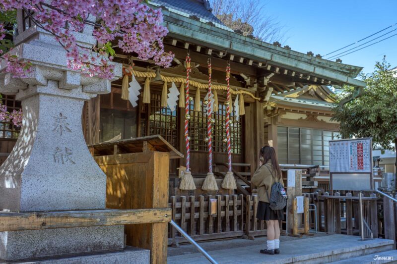 這是一座隱身在住宅區中的小神社,整體氛圍靜謐清幽。3月初,神社境內的櫻花已悄然綻放,在參拜的同時,也能一邊欣賞櫻花飄落的春日景色。