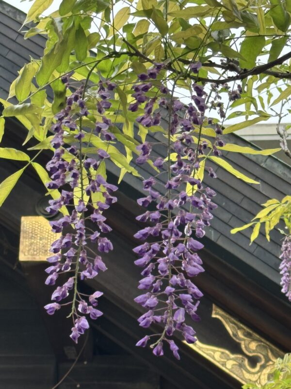 国领神社的「千年之藤」被选为「调布八景」之一,据说这颗藤树已有约400~500年的历史,长久以来备受人们敬仰。每到四月下旬至五月上旬,这里的紫藤花便会开始盛开,黄金周期间更是最佳的观赏时机。紫藤花盛开时,花香不仅弥漫神社境内,甚至飘散至周边街道,吸引不少游客前来参拜、赏花。
